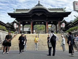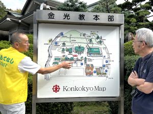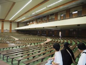 一同は境内に入り、神殿となる本部広前会堂を参拝。この日は昭和34年に建立された広前祭場の内部も見学できました。祭場は1万人が着席できる圧巻のスケールで、信仰の場特有の神聖な空気に包まれています。そのほか立教聖場や修徳殿なども巡り、明治・大正・昭和の時代ごとに創られた宗教建築を鑑賞しました。