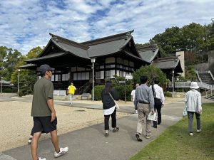次は境内を出て山側を歩き、歴代教主を祀る奥城や金光教学院などの関連施設を巡りました。教学研究所の洋館は、江川三郎八の設計により昭和5年に建てられた貴重な近代建築です。一同は塔屋や玄関ポーチといった独特の建築形式を外から鑑賞し、金光教の多彩な建築群にますます興味を膨らませていました。
