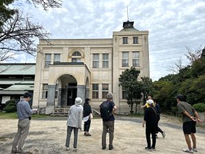 秋の爽やかな気候に恵まれた7回目の建築探偵団。今回は十数名の参加者が、金光教本部の研修施設「光風館」に集まりました。まずは講師の石田さんと、大谷地区のまち歩きガイドを務める西さんから、金光町の歴史や特徴について説明を受けました。