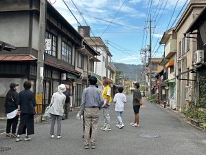 後半は門前町の中心部へと移動。ノスタルジックなまち並みは映画「とんび」のロケ地になり、古き良き建物が多く残っています。中でも特徴的なのは、かつて参拝客の宿泊場所として使われた木造三階建ての建物。他にも懐かしさ漂う店先や看板、石田さんが注目する八つ棟の木造神殿や金光教徒社といった関連の建物など見どころがたくさん。西さんからは映画撮影時のエピソードも飛び出し、さまざまな要素を楽しめる時間となりました。