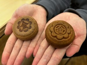 石田さんは、まちの魅力を深めるためのキーワードとして名物菓子「金光饅頭」の文化を取り上げました。そこで散策中には金光饅頭を販売する2軒の菓子店に立ち寄り、甘いおやつでブレイクタイム。最後は光風館に戻り、金光饅頭を食べ比べながらまち歩きや建築探訪の感想を述べあいました。参加者からは「建築を通して、新たな視点でまちづくりを考えることができた」「金光町ならではの歴史を知って、想像よりもスケールの大きな体験になった」という感想がありました。