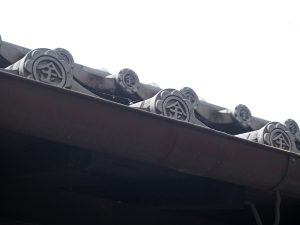 その後は金光教本部の境内に向けて移動を開始。道中では立派な外塀や石垣、金光教の「金」の御紋がかたどられた屋根瓦、商店街のトラス式アーケードなどに注目。少し歩くだけでも、金光教の門前町ならではの個性的なまち並みを感じられます。石田さんの詳しい解説が始まると、参加者も独特の意匠に目を向けながら、町の風景や建物を写真に収めていました。