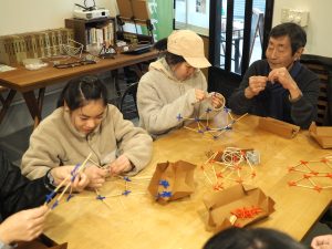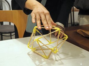 後半は昼食を挟んで、フラーが発明した多面体のおもちゃ「ジタバッグ」を使って遊ぶワークショップを行いました。今回使用したジタバッグは、岡山市在住の造形作家、向井宏志さんが製作。まずは材料を組み立てて、曲げながら幾何学的な形の変化を楽しみます。ジタバッグは竹ひごをシリコン製のジョイントでつないだ丈夫な造りで、折り畳む時の心地よい感触がクセになります。子どもたちは積極的に手を動かし、2個を組み合わせたり帽子にしてみたりと自由に発想を広げました。参加者は芹沢さんを交えて、フラーの人物像や発明品についてトークを展開しました。最後は大きな多面体作りに挑戦。時間内の完成は叶わなかったものの、会話が弾む楽しい時間となりました。
