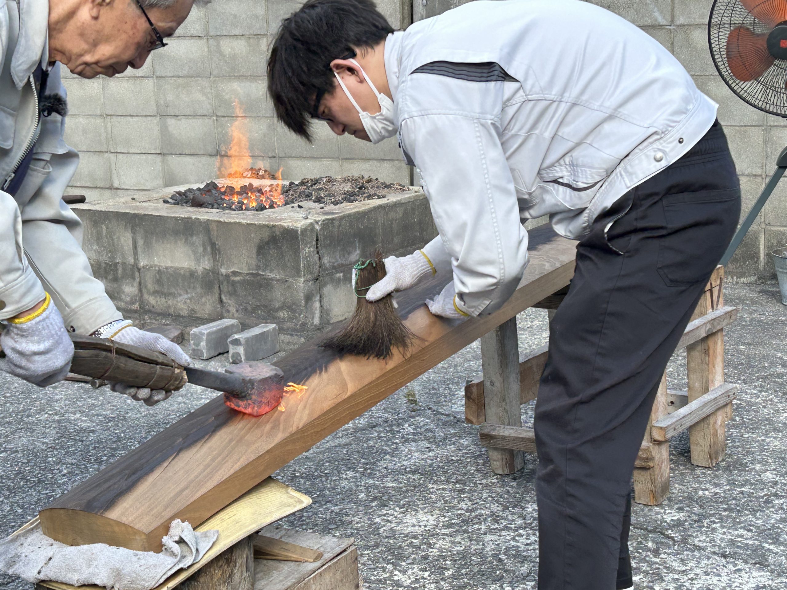 今度は屋外に移動。ともに箏づくりを行う息子さん達とともに「焼き入れ」の作業を実践していただきました。