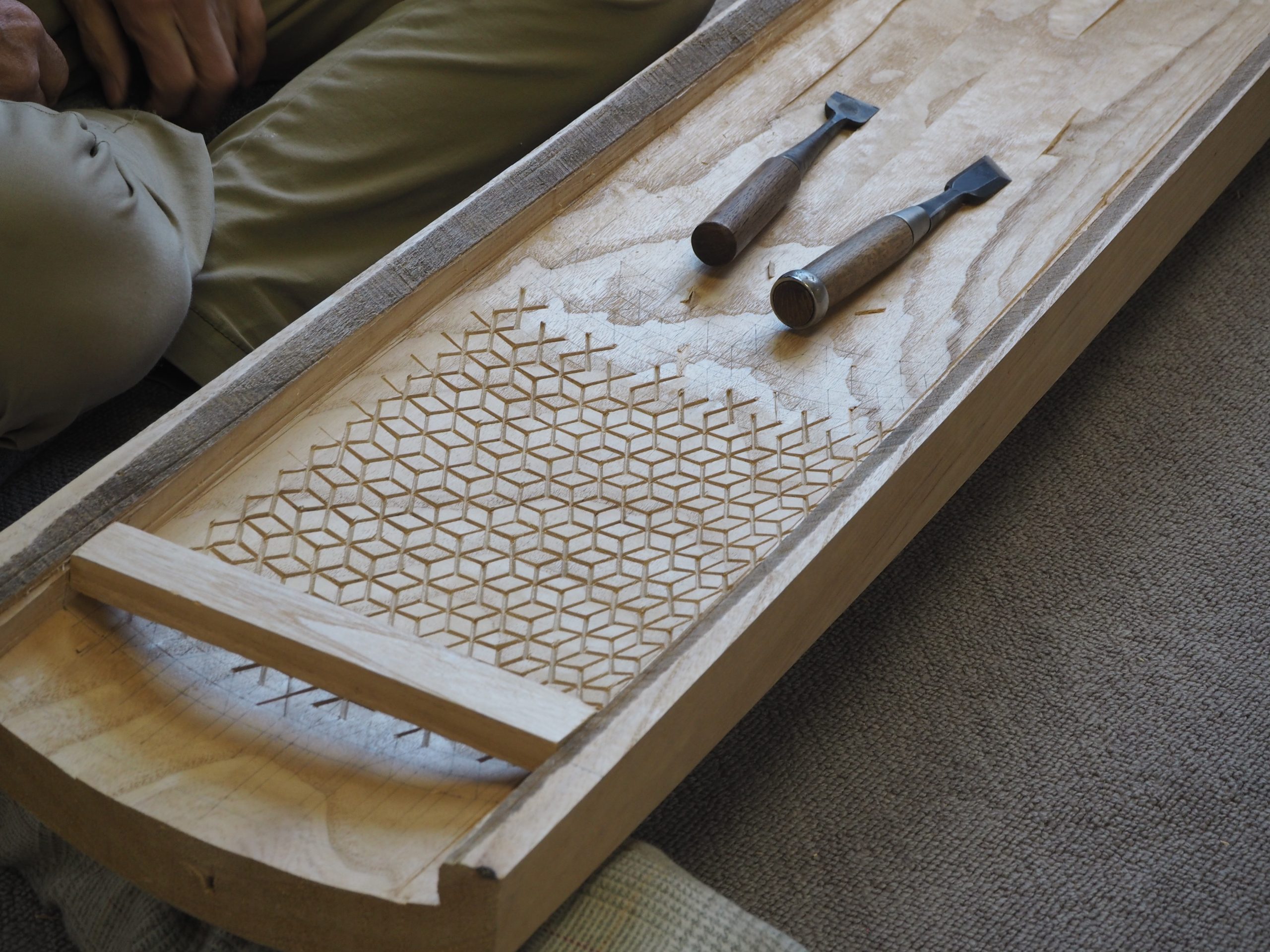 続いて、箏の裏側に模様を掘る工程。良く研いだノミで木の表面を細かく彫っていき、数日かけて本体に細やかな装飾を施します。模様彫りのコツや道具のこだわりについても語ってくださいました。