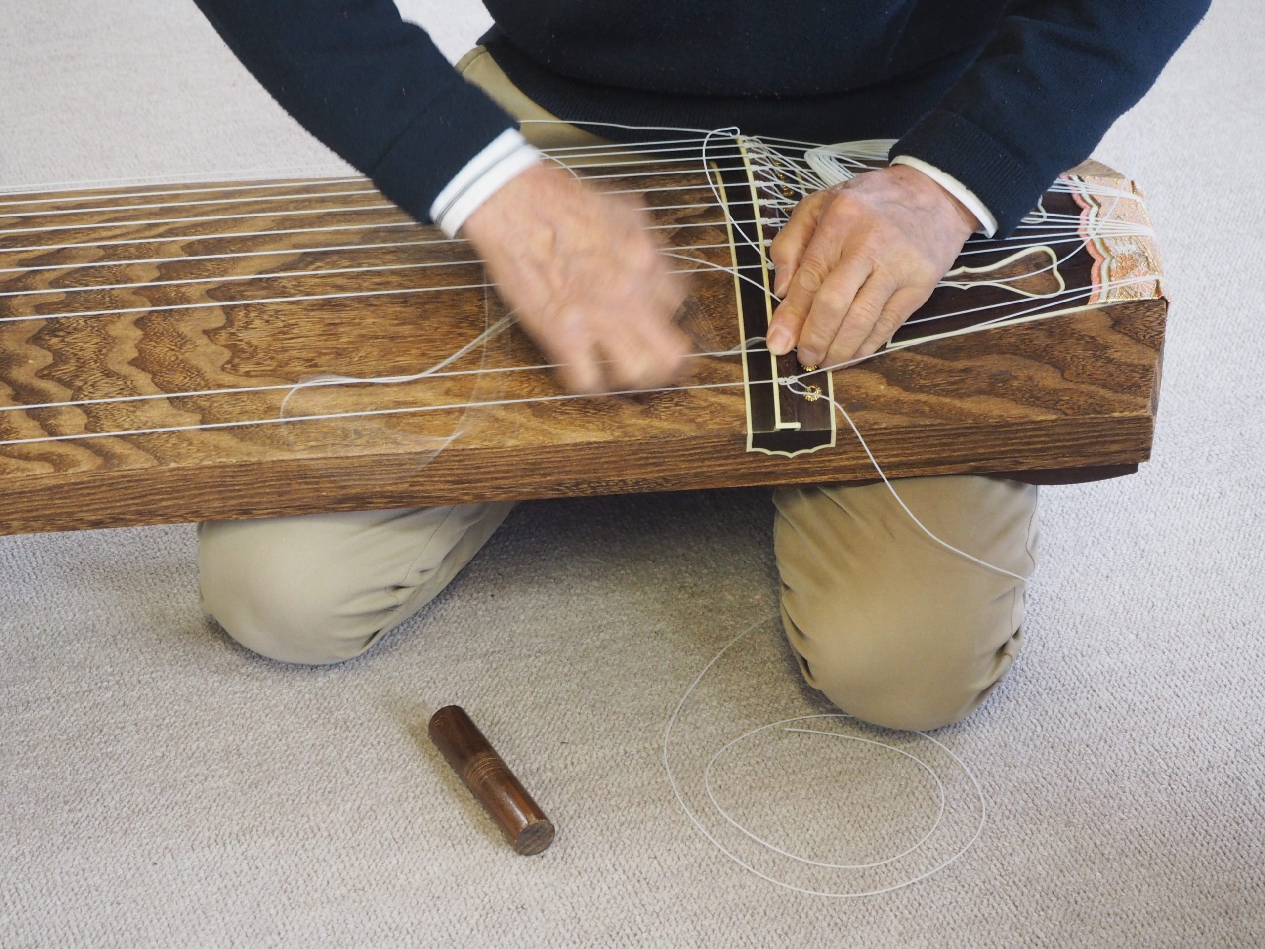 必要な金具や装飾品を取り付けたら、最後は箏に弦を張る工程。糸の張り方や糸の締め具合によって箏の音色が変わるため、弦の扱いには熟練の職人技が必要とされます。