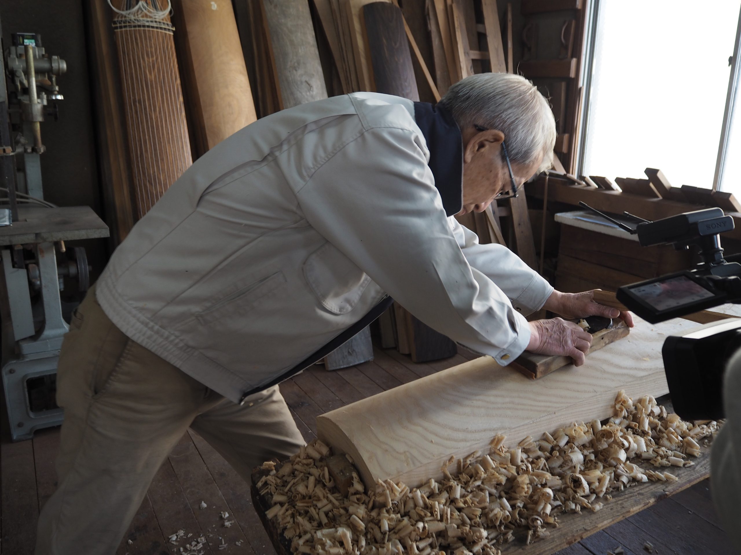 インタビュー後は一連の作業工程を見学。別の作業場に場所を変えて、箏の上面を削る工程に移ります。ノミやカンナなどの道具を上手く使い分けながら、丁寧に根気よく表面を削っていきます。昔は多くの職人が分業制で箏をつくっていましたが、現在は少人数や1人で全工程を手掛けているのだそう。